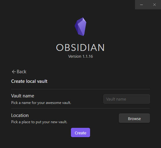 On the next screen, for the Vault name, write zettelkasten or something. You can always change it later.Then, click browse to pick the location on your computer where you’d like all your notes to be saved.