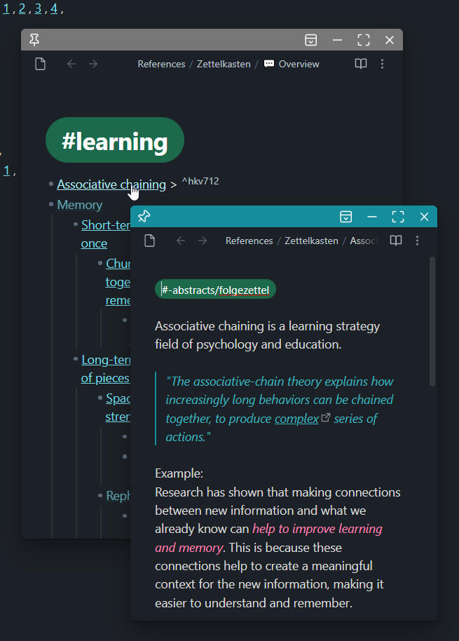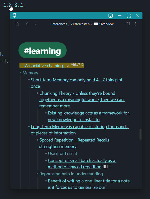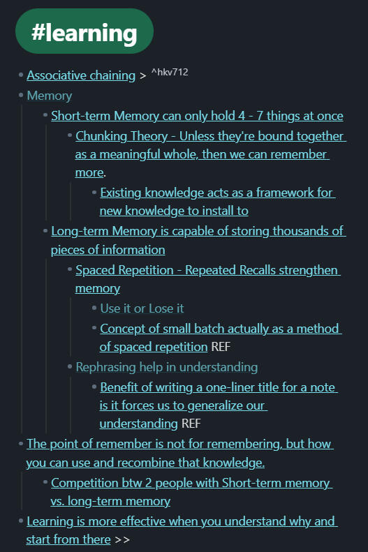 Right after associative chaining is memory…Under memory, I see notes on short-term memory and long-term memory.Then, suddenly...A new connection happened in my meat brain.C.O.N.V.O. actually improves our memory!🤯This is what Niklas Luhmann meant when he called his zettelkasten his communication partner. You ask it a question, and you might be surprised by what you find.