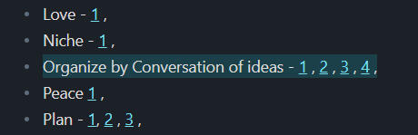 As mentioned before, Luhmann saw his zettelkasten as a conversation partner to help him write.So, when he said to ask it a question, all he meant is to look through the index for keywords that point to conversations related to a particular topic.For example, let’s say I want to write an essay about C.O.N.V.O - or the conversational organization of notes via the Overview.As I look through my index… the entry keyword, Organize by Conversation of ideas, is an obvious one to explore: