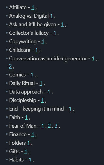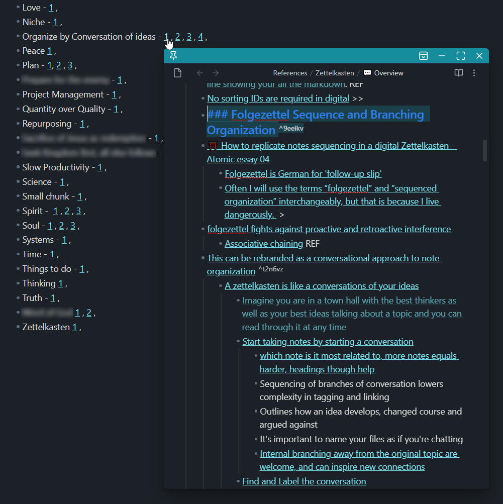 This brings me to the Overview page where there’s a sequence of notes about folgezettel. This again is that other zettel word we decided not to use. Yet, here it is again… 😅You can see, at the 4th bullet point, folgezettel is just a German word meaning ‘follow-up slip’ or as we say, C.O.N.V.O.So, nothing too surprising here.Now, I could pull some of these notes out and create an article. But, I like to live dangerously, so let’s go further. Let’s see what else we can find that might be more surprising.Let’s check out the 2nd link: