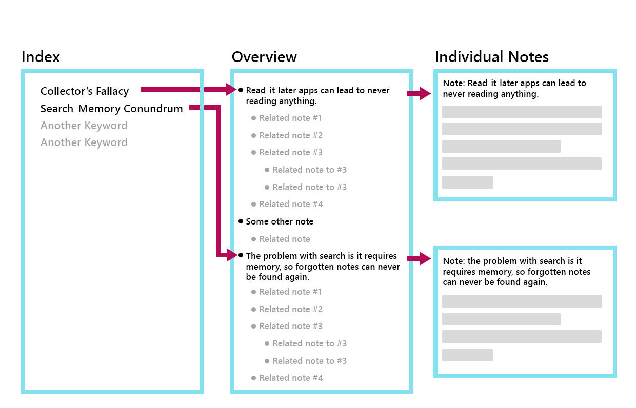 As your notes grow, these conversations between ideas will become more and more interesting. When something emerges, all you need is to add an entry keyword into the discussion.In this way, knowledge can truly compound over time.No longer do you need to filter for useful notes. You just pick an entry keyword and dive in to see all the different perspectives surrounding an idea and how your thoughts branched out and evolve over time.