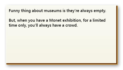 You could abstract this idea generally, using keywords like art, Monet, or museum. That could work, but it's often more useful to generalize by: seeing an idea as an example of a greater phenomenon.In this example, Luhmann suggested abstracting this idea as a quirk in human psychology. Which, could be rephrased as 'preference for what is temporally limited.'Now, that’s a mouthful, so let’s just call it ‘FOMO’. 😎When you do this, instead of slotting this note into a conversation about art without thinking, maybe it can be slotted somewhere else?How about psychology?Do you see it? As soon as you abstract an idea, it's free to go outside of its original context.So, you could check out other keywords in your index related to psychology. Maybe you’ll find notes about how buyers make purchasing decisions.Then, all of a sudden, a note about art museums become useful as an example for using FOMO to get people to buy something.
